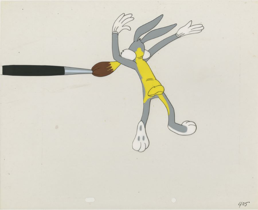 A production cel from the Warner Bros. Studios animated film "Rabbit Rampage" (1955). Featuring Bugs Bunny being harassed by an omniscient paint brush, the hand-painted cel was created at the studio and used during the animation process. The piece is an actual frame of animation that was photographed and appears in the cartoon. Measuring 10.5"x12.5" overall, the cel is in very good condition with minimal surface scratches and minor curling. The paint has been professionally restored and the cel will include a printed reproduction background upon request.